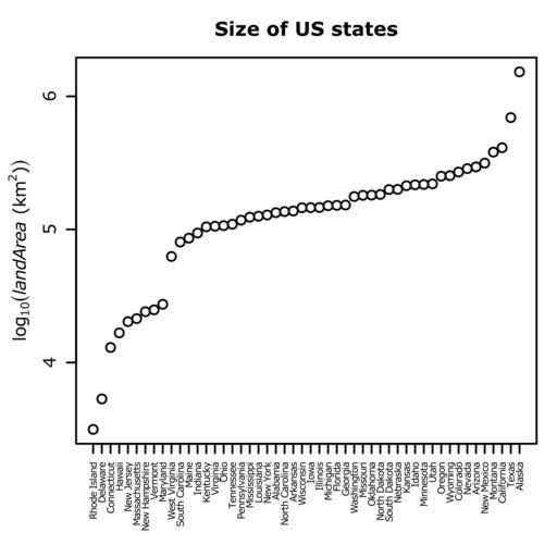 Keywords: R-US state areas-quantile log.svg en Quantile plot example for log-transformed data Data US state areas own HYanWong 2009-03-06 Created with R using the following commands <pre> svg file R-US_state_areas-quantile_log svg width 4 height 4 pointsize 8 Quantile plot example for log-transformed data Data US state areas par mar c 6 4 3 1 +0 1 X <- log10 state area 2 58998811 plot sort X main Size of US states xlab ylab expression log10 paste italic landArea km 2 mgp c 2 5 1 0 yaxt n xaxt n axis 1 seq_along state name state nameorder X cex axis 0 5 las 3 axis 2 4 6 dev off </pre> Uncategorized 2015 March 23