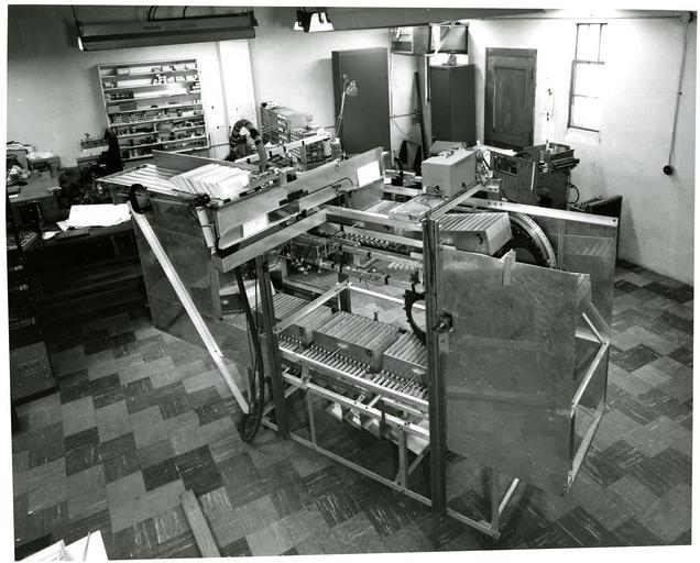 | Keywords: RabinowJacob 054.jpg In 1957 Jacob Rabinowâ ‚¬ „˘s company Rabinow Engineering designed a mechanical coding and sorting system for the U S Post Office Based on similar work Rabinow had done previously for the Census Bureau the system for the Post Office consisted of a conveyor belt cart designed to carry 12 envelopes in separate compartments Each compartment in the cart was accompanied by an escort memory The escort memory consisted of a shaft carrying a series of nylon code wheels Each of the 134 wheels could move laterally into one of two positions With this combination more than 8000 in decimal notation binary numbers could be set Twelve keyboard operators would read envelope addresses and set the positions of the code wheels The wheels were supported on a track also composed of binary elements When the encoded compartment hit the same encoded position on the track the shaft dropped triggering a door release in the compartment holding the envelope The envelope then fell into the appropriate pocket About 600 of the letter sorting machines were built and used by the Post Office In later operations optical character recognition technology replaced the keyboard operators and the mechanical escort memory was replaced by computer memory Reference Inventing for Fun and Profit Jacob Rabinow San Francisco Press San Francisco CA 1990 pp 100-138 National Institute of Standards and Technology 4/1/1958 National Institute of Standards and Technology PD-USGov-NIST PD-USGov Postal equipment |