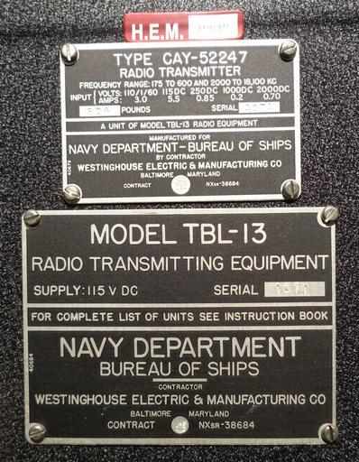 | View Original: | Radio Transmitter Model TBL-13, US Navy, Westinghouse - National Electronics Museum - DSC00254.JPG (3443x4427) | |||