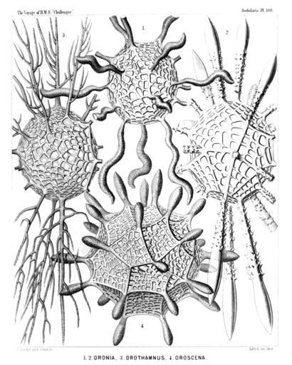 | Keywords: Radiolaria (Challenger) Plate 106.jpg follows <table> <tr> <td style text-align center; vertical-align top; colspan 3 >Plate 106 Orosphærida </td> </tr> <tr> <td style font-size 85 ; text-align right; vertical-align top; colspan 3 >Diam </td> </tr> <tr> <td style font-size 85 ; padding-left 3em; text-indent -1em; vertical-align top; >Orosphærida </td> </tr> <tr> <td style vertical-align top; >Fig 1 Orosphæra serpentina n sp </td> <td style vertical-align bottom; >×</td> <td style text-align right; vertical-align bottom; >50</td> </tr> <tr> <td style font-size 85 ; padding-left 3em; text-indent -1em; vertical-align top; >The entire shell </td> </tr> <tr> <td style vertical-align top; >Fig 2 Orosphæra horrida n sp </td> <td style vertical-align bottom; >×</td> <td style text-align right; vertical-align bottom; >50</td> </tr> <tr> <td style font-size 85 ; padding-left 3em; text-indent -1em; vertical-align top; >The entire shell </td> </tr> <tr> <td style vertical-align top; >Fig 3 Orosphæra arborescens n sp vel Orothamnus arborescens </td> <td style vertical-align bottom; >×</td> <td style text-align right; vertical-align bottom; >50</td> </tr> <tr> <td style font-size 85 ; padding-left 3em; text-indent -1em; vertical-align top; >The entire shell </td> </tr> <tr> <td style vertical-align top; >Fig 4 Oroscena gegenbauri n sp </td> <td style vertical-align bottom; >×</td> <td style text-align right; vertical-align bottom; >50</td> </tr> <tr> <td style font-size 85 ; padding-left 3em; text-indent -1em; vertical-align top; >The entire shell </td> </tr> <tr> <td style font-size 85 ; padding-left 3em; text-indent -1em; vertical-align top; > Compare Pl 12 fig 1 </td> </tr> </table> https //archive org/details/reportonradiolar00haecrich 1887 Ernst Haeckel 1834-1919 ; engravings by Adolf Giltsch 1852-1911 PD-old-auto-1923 1919 Report on the Radiolaria |