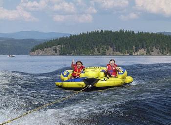 Keywords: rafting kids inner tube summer fun activity human children sitting lake water landscape scenic canim lake british columbia canada mountains outside outdoor beautiful scenery
