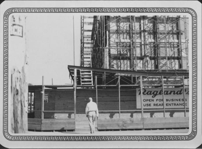 | Keywords: steel steel industry steelindustry steel construction steelconstruction construction industry constructionindustry construction equipment constructionequipment buildings blackandwhite monochrome photo border black and white Photograph of Ragland's, a store in Kingsville, Texas, under construction during a remodeling. The construction was done by Arthur Brothers Incorporated using materials provided by John Dollinger Jr., Inc. A man can be seen walking in to a walkway that surrounds the building. To the right is a sign that says "Ragland's, Open for business, use rear entrance." Scaffolding is on all sides of the building. Photograph of Ragland's, a store in Kingsville, Texas, under construction during a remodeling. The construction was done by Arthur Brothers Incorporated using materials provided by John Dollinger Jr., Inc. A man can be seen walking in to a walkway that surrounds the building. To the right is a sign that says "Ragland's, Open for business, use rear entrance." Scaffolding is on all sides of the building. |