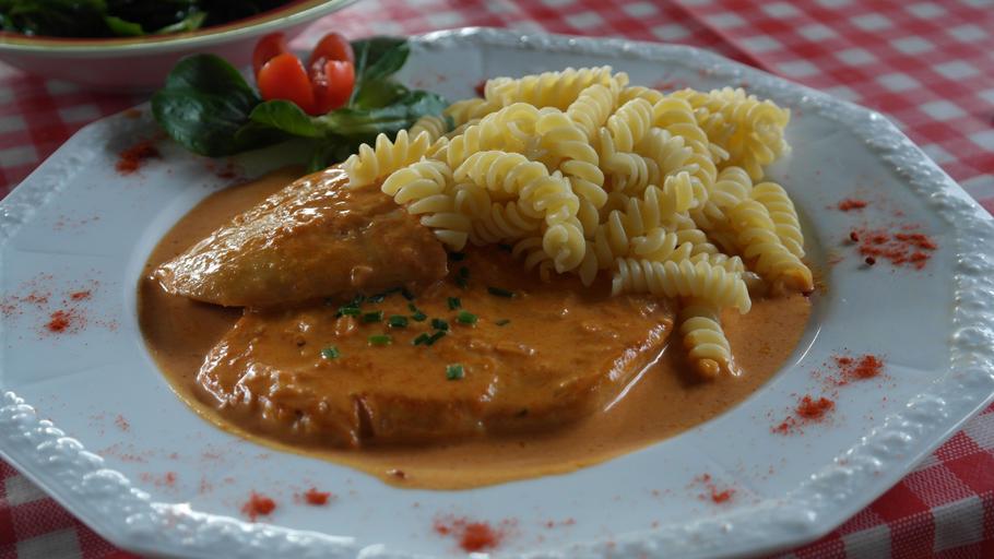 Keywords: rahmschnitzel schnitzel eat food meat court noodles sauce paprika cook cream sauce