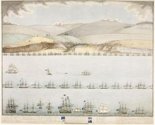 | Keywords: Raid on Boulogne 1804 colour.jpg en Plan and key The Attack on Boulogne Oct 1804 Watercolour showing the situation prior to the British assault on the night of 2 October 1804 In the foreground is the main British squadron with Admiral Lord Keith's flagship the two-decker 'Monarch' 74 guns in the centre and frigates and sloops around it Behind them is a line of smaller British sloops and brigs Behind that to the left a Dutch merchant ship is about to be intercepted Some of the French invasion craft are in a line close to the shore behind an invisible sandbank The town and harbour of Boulogne are behind also filled with invasion craft and with strong shoreline fortifications Napoleon's 'Army of England' are shown encamped in the heights above the town http //www nmm ac uk/collections/nelson/viewRepro cfm reproID PZ6989 picture 1 content The National Maritime Museum E D Lewis 1804 PD-old-100 Naval battles in art |