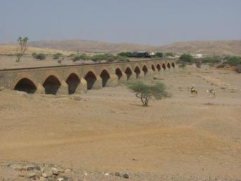 Keywords: Railbridge Obel river.JPG en 14-arch Railbridge over Obel river Eritrea On the right hand side Foundations of predecessing rail bridge de 14-Bogen-Eisenbahnbrücke über den Obel Eritrea Rechts Fundamente der Vorgängerbrücke own Reinhard Dietrich 01 10 2011 Cc-zero Railway bridges in Eritrea Railway coaches of Eritrea Stone arch railway bridges Narrow gauge bridges Rivers of Eritrea |