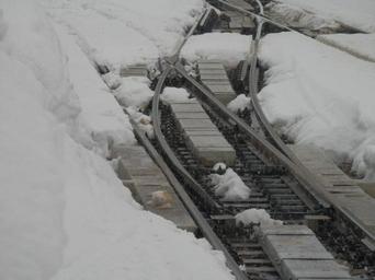 Keywords: Railroad switch Warm air injection port Matsudai 20150215.jpg en Hot air heater is installed for snow melting of railroad switch at Hokuhoku Line Matsudai Sta A duct box shape which is between the rails Railway points in Japan Heated points Hokuetsu Express Hokuhoku Line Matsudai Station |