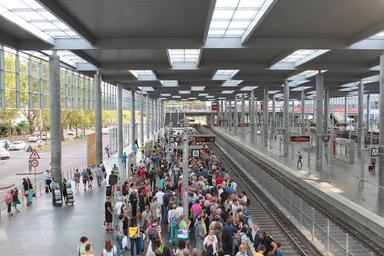 Keywords: railway station group of people platform crowds waiting railroad track gleise crowd people collection