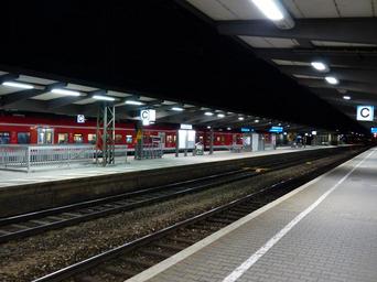 Keywords: railway station platform train railway breakpoint old traffic rail traffic railroad track track central station ad clock departure transport seemed luggage cart stairs