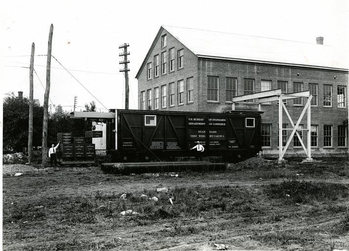 | Keywords: RailwayTestCar 002.jpg  The design shown consists of eight 10 000 lb weights; four 2500 lb weights; 10 000 lbs of 50 lb weights and a truck used to carry the test load on the rails which is in itself 5 000 lbs as well as small auxiliary balances and weights giving this vehicle a total weight of over 105 000 lbs Small weights are furnished which run down to 1/10 000 of a pound Only decimal sub-divisions of a pound are used in this work Power for handling the weights is furnished by an electrical generator driven by a gasoline engine When in use teh car is set a short distance from the end of the scale the end doors of the car are opened and the overhead crane rails are advanced by means of a motor until they overhang the track by the required amount The truck is then connected to the crane and lifted from its position in the car and placed on the rails outside This is then followed by weights until the first test load is ready A cable is then connected to the truck and by means of a motor forming a part of the truck the truck and test load are moved from place to place on the car When the run is completed with this load other weights are added and the observations repeated on the higher loads for the different positions on the scale National Institute of Standards and Technology 1913-01-01 National Institute of Standards and Technology PD-USGov-NIST PD-USGov National Bureau of Standards National Institute of Standards and Technology Rail transport safety Crash tests rail  |