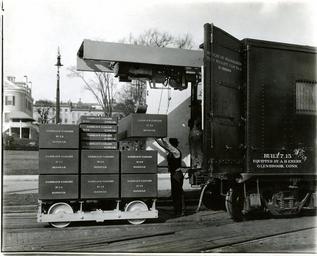 | Keywords: RailwayTestCar 003.jpg  The design shown consists of eight 10 000 lb weights; four 2500 lb weights; 10 000 lbs of 50 lb weights and a truck used to carry the test load on the rails which is in itself 5 000 lbs as well as small auxiliary balances and weights giving this vehicle a total weight of over 105 000 lbs Small weights are furnished which run down to 1/10 000 of a pound Only decimal sub-divisions of a pound are used in this work Power for handling the weights is furnished by an electrical generator driven by a gasoline engine When in use teh car is set a short distance from the end of the scale the end doors of the car are opened and the overhead crane rails are advanced by means of a motor until they overhang the track by the required amount The truck is then connected to the crane and lifted from its position in the car and placed on the rails outside This is then followed by weights until the first test load is ready A cable is then connected to the truck and by means of a motor forming a part of the truck the truck and test load are moved from place to place on the car When the run is completed with this load other weights are added and the observations repeated on the higher loads for the different positions on the scale National Institute of Standards and Technology 1913-01-01 National Institute of Standards and Technology PD-USGov-NIST PD-USGov National Bureau of Standards National Institute of Standards and Technology Rail transport safety Crash tests rail  |