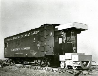 Keywords: RailwayTestCar 004.jpg The test cars were also used to calibrate other industrial railroad scales whenever the NBS schedule permitted A total test load of 80 000 pounds was carried by each car This consisted of 7 ten thousand-pound weights 3 of which were mounted on the small truck right and the truck itself which was adjusted to weigh exactly 10 000 pounds Auxiliary equipment was carried on the car for proper handling of the test weights National Institute of Standards and Technology 3/10/1949 National Institute of Standards and Technology PD-USGov-NIST PD-USGov National Bureau of Standards National Institute of Standards and Technology Rail transport safety Crash tests rail