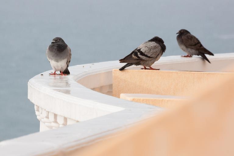 Keywords: rain pigeons wet parapet mirroring white rounding