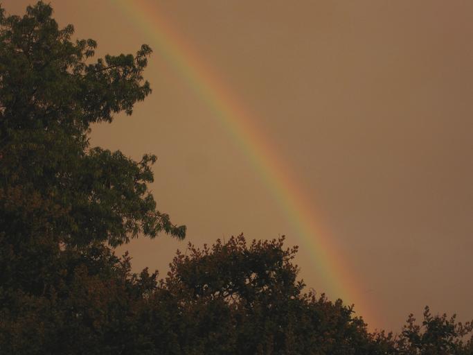 Keywords: rainbow arc colorful multi-coloured glowing storm moist air weather phenomenon tree dusky sky