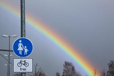 Keywords: rainbow atmospheric optical phenomena bow shaped strip lighting radial farbverlauf spectrum wavelength dependent refractive by sunlight traffic sign light poles grey colorful