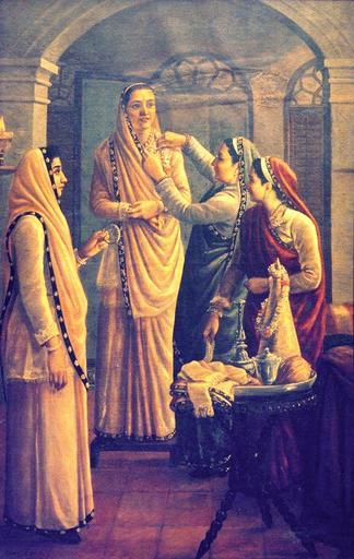 | Keywords: Raja Ravi Varma, Decking the bride.jpg Artwork Creator Raja Ravi Varma Decking the Bride Decorating a bride probably a w Maharashtra Maharashtrian family വധുവിനെ ഒരുക്കുന്നു വി മഹാരാഷ്ട്ര മഹാരാഷ്ട്രയിലെ കുടുംബമാകാനിടയുണ്ട് Oil on canvas w Kowdiar Palace Thiruvananthapuram Kerala വി കവടിയാർ കൊട്ടാരം തിരുവനന്തപുരം കേരളം object history credit line accession number http //www museumsyndicate com/item php item 25463 Malayalam loves Wikimedia event 2011 April PD-Art-100 Paintings of women of India by Raja Ravi Varma Brides in art Art of India in the Kowdiar Palace Paintings of women of Maharashtra Hindu wedding in art Marriage in art of India Brides of India Hindu weddings in India |
