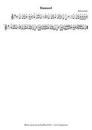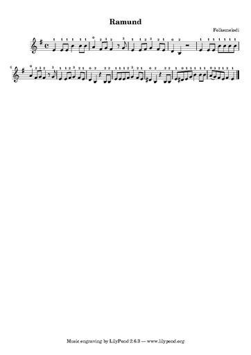 | Keywords: Ramund-violin.png Danish folk song with unknown artist and composer The sheet music is with help for beginner violin Lilypond <pre> <nowiki> \include deutsch ly \version 2 6 4-5 \header title Ramund composer Folkemelodi melody \clef treble \time 4/4 \key e \minor \relative c' e4-1 e8-1 e-1 h'4-1 h8-1 h-1 a4-0 fis8-2 g-3 fis4-2 r8 g8-3 e4-1 e8-1 fis-2 g4-3 fis8-2 e-1 d4-0 h-2 r2 e4-1 e8-1 e-1 h'-1 h-1 h-1 h-1 a4-0 fis8-2 g-3 fis4-2 r8 g-3 e4-1 e8-1 fis-2 g4-3 fis8-2 e-1 d4-0 h-2 r h8-2 h-2 e8-1 e-1 e-1 fis-2 g4-3 fis8-2 e-1 dis4-0 h-2 r h8-2 h-2 e8-1 dis-0 e-1 g-3 h4-1 h8-1 h-1 a8-0 g -3 fis-2 e-1 fis4-2 e-1 \bar \score \new Staff \melody </nowiki> </pre> Also See Ramund mid Find midi here <br> Ramund ogg Find Ogg here <br> thumb 250px left Music Sheet <br style clear both; > PD-old Music of Denmark |