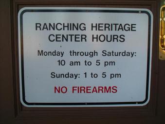 | Keywords: Ranching Hours.JPG Museum hours sign at the National Ranching Heritage Center At Texas Tech University in Lubbock Texas Self made Transferred from http //en wikipedia org en wikipedia; transferred to Commons by User Wordbuilder using http //tools wikimedia de/~magnus/commonshelper php CommonsHelper own work of Victorgrigas 2006-01-18 Original uploader was Victorgrigas at http //en wikipedia org en wikipedia Released into the public domain by the author en wikipedia Victorgrigas original upload log page en wikipedia Ranching_Hours JPG 2006-01-18 21 46 Victorgrigas 1632×1232× 641198 bytes <nowiki>self made found in lubbock texas</nowiki> National Ranching Heritage Center x Signs in Texas |