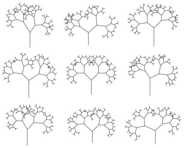 | Keywords: RandomizedPythagorasLsystem.svg en Example of stochastic L-system by randomizing angle and step by +-30 cs Ukázka stochastického L-systému s randomizovaným úhlem a délkou kroku o +-30 own NightElfik L-Systems Pythagoras trees Files by User NightElfik Fractals created with Malsys |