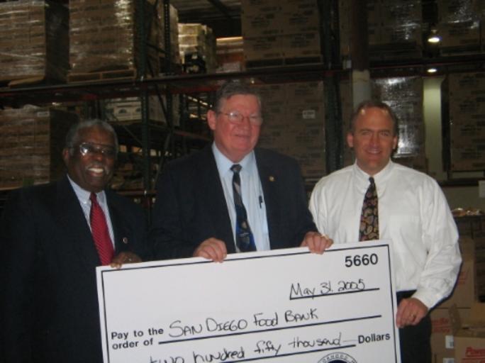 Keywords: Randy-Cunningham-money.jpg Photo United States House of Representatives - http //cunningham house gov/Photos/ PhotoID 28862 Congressman Randy Duke Cunningham presented a check to the San Diego Food Bank for federal funding secured for the Building Against Hunger campaign The funding will assist the Food Bank to purchase and fully equip a new central warehouse and distribution center The new facility will be used to accept additional donated products provide more nutritious meals increase the volume of food distributed and increase services to more hungry residents throughout San Diego County PD-USGov May 2005 in the United States 2005 in San Diego Duke Cunningham Food banks Oversized cheques |