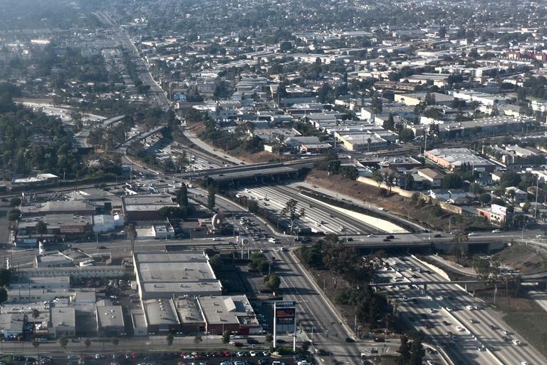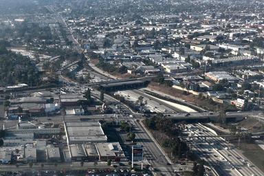 Keywords: Randy's Donuts LA, seen from Air on approach to LAX.jpg en Another view of Randy's Donuts seen from the air just to the left of the freeway I 405 own Northwalker Randy's Donuts Los Angeles Cc-zero