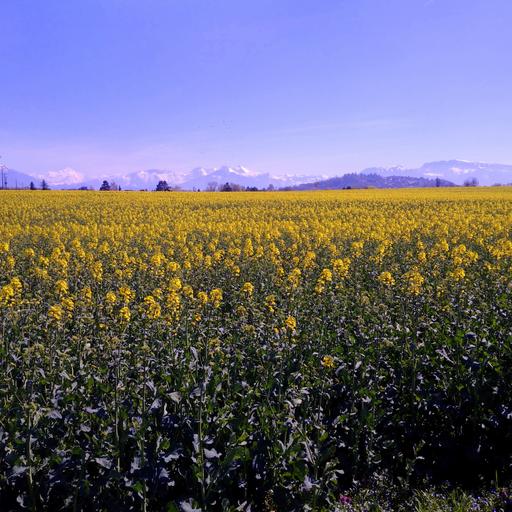 Keywords: rapeseed mont blanc sky blue mountain landscape alps massif alpine nature natural landmark hiking field