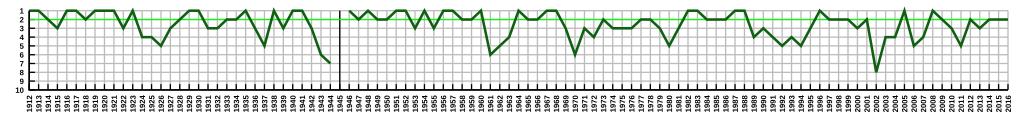 | Keywords: Rapidwien.svg de Bundesligastatistik Rapid Wien v created with gnuplot 5 1 CVS 2014-08-21 reset data 'rapidwien txt' set term svg size 1600 200 font 'Arial Bold' lw 2 set border 3 set grid unset key set xtics 1 nomirror out rotate by 45 right set ytics out nomirror stats data using 2 name 'RW' nooutput set arrow from 1945 1 to 1945 10 nohead set output 'rapidwien svg' set yrange 10 1 plot RW_median lc rgb 0x00FF00 \ data w lines lc rgb 0x0F6011 lw 2 unset output 2014-03-30 12 02 22 own StefanPohl cc-zero SK Rapid Wien Sports statistics |