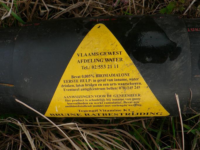 | Keywords: Rattenvergifwaarschuwing edit.JPG rat poison on the Schelde river dike Steendorp Belgium VLAAMS GEWEST AFDELING WATER Tel 02/553 21 11 Bevat 0 005 BROMADIALONE EERSTE HULP in geval van inname water drinken laten braken en een arts waarschuwen Eventueel antigifcentrum bellen 070/245 245 AANWIJZINGEN VOOR DE GENEESHEER Het product is schadelijk bij inname van grote hoeveelheden en werkt cumulatief Bevat een antibloedstollend middel met verlengde werking Tegengif Vitamine K1 BRUINE RATBESTRIJDING FLEMISH REGION DEPARTMENT WATER Tel 02/553 21 11 Contains 0 005 BROMADIALONE FIRST AID in case of ingestion drink water induce vomiting and notify a physician Call poison control center when necessary 070/245 245 DIRECTIONS FOR PHYSICIAN The product is harmful when ingested in large quantities and has a cumulative effect Contains an anticoagulant with prolonged activity Antidote Vitamin K1 BROWN RAT DESTRUCTION Rattenvergifwaarschuwing JPG 2008-12-16 00 31 UTC derivative work Fvasconcellos<small> t·c </small> Rattenvergifwaarschuwing JPG Aliq levels adjusted minor sharpening Fvasconcellos Rattenvergifwaarschuwing JPG Rodenticides |