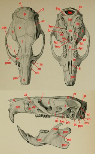 | Keywords: Rattus macleari skull labeled.svg en skull of Maclear's Rat Rattus macleari labeled ---- cranium as alisphenoid bo basioccipital bone bs basisphenoid bt tympanic bulla cl lambdoidal crest cnl nasolacrimal capsule co occipital condyle ct temporal crest f frontal bone fhg hypoglossal foramen fi incisive foramen flm middle lacerate foramen fm foramen magnum fmp mesopterygoid fossa fo foramen ovale foa accessory foramen ovale fpl palatine foramen fpt pterygoid fossa ip interparietal bone j jugal bone l lacrimal bone m maxillary bone ms mastoid n nasal bone o occipital bone os orbitosphenoid p parietal bone ph hamular process pl palatine bone pm premaxillary bone ppo paroccipital process pt pterygoid pzm zygomatic process of maxilla pzs zygomatic process of squamosal s squamosal bone spv sphenopalatine vacuity zn zygomatic notch zp zygomatic plate zs zygomatic spine ---- mandible cm body of mandible pal alveolar process pan angular process pcn condyloid process pcr coronoid process image Skull_MaclearsRat_BulldogRat png most labels Carleton Musser 1984 Muroid rodents Pp 289 “379 in Anderson Jones Jr Orders and Families of Recent Mammals of the World John Wiley Sons New York fig 51 additional labels Niethammer Krapp 1978 Handbuch der Säugetiere Europas Band 1 Nagetiere I Akademische Verlagsgesellschaft Wiesbaden fig 3 2010-04-23 20 28 UTC Skull_MaclearsRat_BulldogRat png Charles William Andrews 1866-1924 derivative work Torben Schink <span class signature-talk >talk</span> PD-old original upload log This image is a derivative work of the following images File Skull_MaclearsRat_BulldogRat png licensed with PD-old 2009-09-26T10 17 14Z Pmaas 2010x3082 5560454 Bytes <nowiki> en Plate II from A monograph of Christmas Island Indian Ocean It shows the skulls of the Maclear's Rat Rattus macleari and the Bulldog Rat Rattus nativitatis two recently extinct rat spe</nowiki> Uploaded with derivativeFX Charles William Andrews Rattus macleari skulls Foramen magnum Frontal bones Parietal bones |