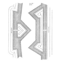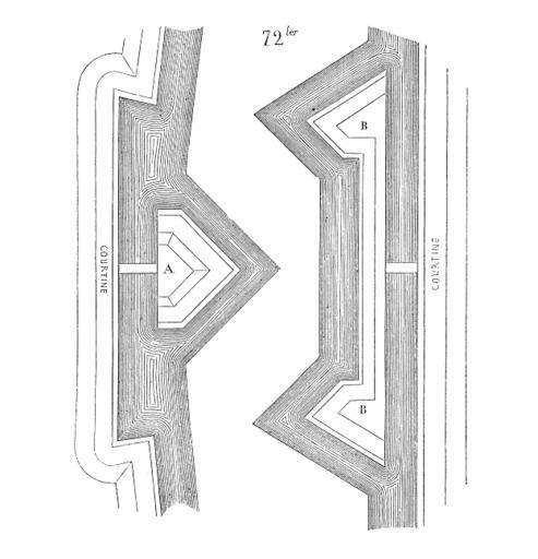 Keywords: Ravelin.et.tenaille.png On laissa donc les bastions ouverts à la gorge mais on établit entre eux et en avant des courtines des ouvrages isolés qui devinrent d'une grande utilité pour la défense et qui furent souvent employés pour empêcher les approches devant des fronts faibles ou de vieilles murailles; on leur donna le nom de <i>ravelins</i> ou de <i>demi-lunes</i> lorsque ces ouvrages ne présentaient que la forme d'un petit bastion et de <i>tenailles</i> si deux de ces ouvrages étaient réunis par un front A est un ravelin et B une tenaille Issu du Dictionnaire raisonné de l'architecture française du XI<sup>e</sup> au XVI<sup>e</sup> siècle par Eugène Viollet-Le-Duc 1856 /Fortification Medieval architecture Ravelins |