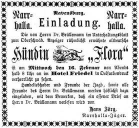 Keywords: Ravensburg Fastnacht 1881 Narrhalla Hündin Flora.jpg Ravensburg Oberschwäbischer Anzeige 1881 Anzeige der Gesellschaft žNarrhalla zu einer Fastnachtssitzung zum Thema žHündin Flora Hotel Friedel 16 Februar 1881 Beate Falk Chronik der Ravensburger Fasnacht 1353 “1968 in Albert Schmid Hrsg Fasnacht in Ravensburg Ein Streifzug von 1353 bis heute Oberschwäbische Verlags-Anstalt Ravensburg 2000 ISBN 3-926891-25-4 S 49 1881 author PD-old-100 History of carnival in Ravensburg 1881 in Germany |