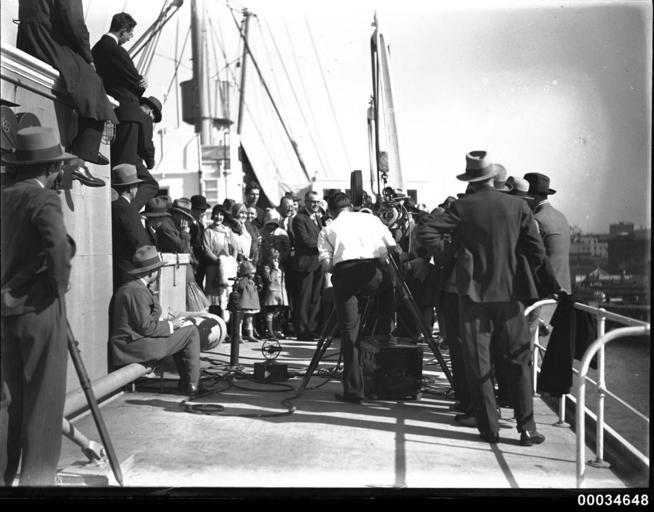 Keywords: ss sierra sssierra san francisco sanfrancisco honolulu sydney harbour sydneyharbour movietone fox movietone news foxmovietonenews movietone news movietonenews movietone truck movietonetruck talkies film circular quay circularquay samuel j hood collection samueljhoodcollection sydney hood collection hoodcollection hood camera motion picture camera motionpicturecamera movie camera moviecamera cameraman microphone ray vaughan rayvaughan blackandwhite monochrome black and white This photograph depicts a crowd of people and a film crew on board SS SIERRA. The photograph was taken in August 1929 at Circular Quay during the welcoming and celebrations of the arrival of Australia's first Movietone News truck. The man filming is Sydney cameraman Ray Vaughan. This photo is part of the Australian National Maritime Museum’s Samuel J. Hood Studio collection. Sam Hood (1872-1953) was a Sydney photographer with a passion for ships. His 60-year career spanned the romantic age of sail and two world wars. The photos in the collection were taken mainly in Sydney and Newcastle during the first half of the 20th century. The ANMM undertakes research and accepts public comments that enhance the information we hold about images in our collection. This record has been updated accordingly. Photographer: Samuel J. Hood Studio Collection Object no. 00034648 This photograph depicts a crowd of people and a film crew on board SS SIERRA. The photograph was taken in August 1929 at Circular Quay during the welcoming and celebrations of the arrival of Australia's first Movietone News truck. The man filming is Sydney cameraman Ray Vaughan. This photo is part of the Australian National Maritime Museum’s Samuel J. Hood Studio collection. Sam Hood (1872-1953) was a Sydney photographer with a passion for ships. His 60-year career spanned the romantic age of sail and two world wars. The photos in the collection were taken mainly in Sydney and Newcastle during the first half of the 20th century. The ANMM undertakes research and accepts public comments that enhance the information we hold about images in our collection. This record has been updated accordingly. Photographer: Samuel J. Hood Studio Collection Object no. 00034648