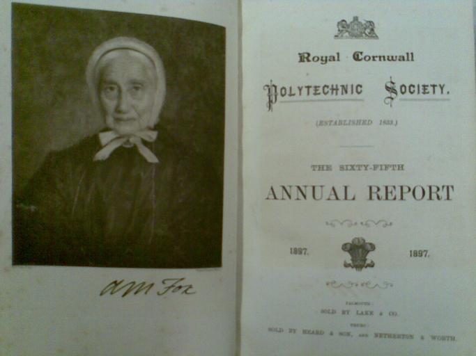 | Keywords: RCPS-Report1897.jpg Front opening of the Annual Report of the Royal Cornwall Polytechnic Society for 1897 showing a portrait of Anna Maria Fox 1817-1897 as the Frontispiece The volume contains her obituary own 2008-04-25 Vernon39 1832 Learned societies of the United Kingdom People of Falmouth Cornwall People of the Victorian era Mining in Cornwall Title pages from England Photographs by Vernon White | ||||