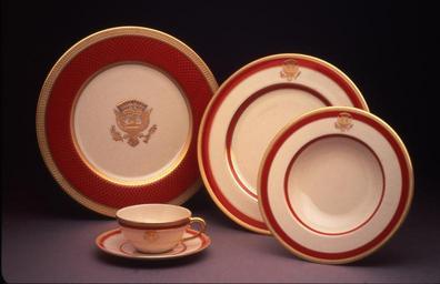 | Keywords: Reagan presidential china service 1982.jpg en China service purchased in 1982 during the administration of President Ronald Reagan and used at the White House in Washington D C in the United States Left is a charger or service plate with a broad red rim First Lady Nancy Reagan's favorite color Charger plates were used as decorative pieces and remained in front of the diner at all times Other plates were placed on top of the charger plate Right is a soup plate a shallow dish used for soup appetizers or desserts which may have sauces In the middle is a dinner plate A teacup and saucer are lower left http //amhistory si edu/img/firstladies/58-800 jpg National Museum of American History Smithsonian Institution 2013 White House china of the Ronald Reagan administration PD-USGov |