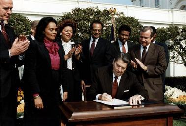 Keywords: Reagan signs Martin Luther King bill.jpg President Ronald Reagan signs the bill commemorating Martin Luther King Jr 's birthday as a national holiday on Nov 2 1983 in the White House rose garden http //www af mil/photos/index asp galleryID 843 page 2 1983-11-02 White House Photo Office White House Photo PD PD-USGov Ronald Reagan in 1983 19831103 Coretta Scott King White House Rose Garden 19831102 Martin Luther King Jr Day Presidents of the United States signing legislation 19831102 African American history of the 1980s |