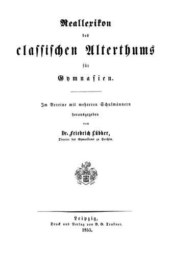 | Keywords: Reallexikon des classischen Alterthums für Gymnasien Title page.jpg en Title page of Reallexikon des classischen Alterthums für Gymnasien ru Титульный лист «Реального слова я классических д евностей для гимназий» http //books google ru/books id GVw6AAAAcAAJ pg PA986 dq inauthor 22Friedrich+L C3 BCbker 22 hl ru ei V7XOTPGFHcnLswbllvCWCA sa X oi book_result ct result resnum 1 ved 0CCkQ6AEwAA v onepage q f false Google Books Friedrich Lübker 1855 PD-old Title pages from Germany 1855 books | ||||