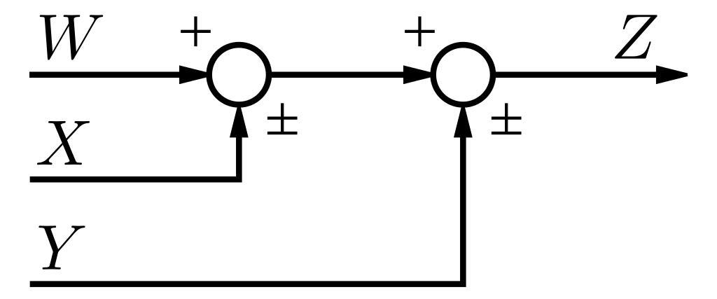 Keywords: Rearranging Summing Junctions 1.svg A block diagram in the control theory sense showing a combination of summing junctions implementing <math>Z W \pm X \pm Y</math> 2008-01-27 Own Work Inkscape Inductiveload See the Control theory block diagrams Control theory block diagrams