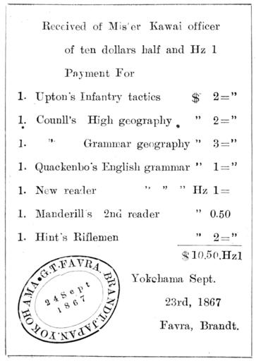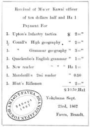 | Keywords: Receipt of books price - Kawai Tsuginosuke.jpg 河井継之助がファブル・ブラントから購入した書籍代金の受領書 河井継之助 (今泉鐸次郎 著 1931年刊)より (原典からグレースケール変換) en Receipt of books price that Kawai Tsuginosuke has purchased from Favra Brandt Gray-scaled 1931年(写 が掲載されている 河井継之助 の刊行年) 河井継之助 (今泉鐸次郎 著 1931年刊) 国立国会図書館デジタルコレクション Japanese book Kawai Tsuginosuke den written by Imaizumi Takujirō published in 1931 Collection of books of the National Diet Library Japan http //dl ndl go jp/info ndljp/pid/1880306/125 NDL http //dl ndl go jp/info ndljp/pid/1880306/125 受領書はファブル・ブラントによるもの の著 は今泉鐸次郎 写 撮影 は不明 other versions 受領書に記載されている書籍名(記載されているまま)<br> Upton's Infantry tactics<br> Counll's High geography<br> Counll's Grammar geography<br> Quackenbo's English grammar<br> New reader English grammar<br> Manderill's 2nd reader<br> Hint's Riflemen<br> 河井継之助 内の次ページ(http //dl ndl go jp/info ndljp/pid/1880306/126 )に掲載されている訳文は以下の り <br> <br> 士官河井君より左の儥として洋 十元半及壹分の請取なり<br> 歩兵操練書 巻 二元<br> 理書 同斷 同斷<br> 同 同斷 三元<br> 英 文典 同斷 壹元<br> 新版素 書 同斷 壹分<br> 第二等同斷書 同斷 半元<br> 施 銃論 同斷 貳元<br> 横濱 千八百六十七年<br> 第 廿三日 ファーブルブランド<br> 右之代金八兩壹 と三百孔を請取る<br> Custom license marker 2016 10 20 PD-Japan-oldphoto Kawai Tsuginosuke |