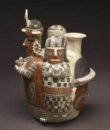 | Keywords: Recuay - Effigy Bottle - Walters 20092037 - Right Side.jpg Northern Peru's pottery traditions focus on three-dimensionality the vessels often modeled into a variety of volumetric forms depicting human figures fruits or vegetables and even architecture The coastal Moche and their highland Recuay neighbors were masters of the modeled form having explored and perfected this tradition whose origins reach back as much as a thousand years among cultures of the Early Horizon 900 -200 BCE Recuay pottery is typically thin-walled and made from a kaolin-based clay Vessels are decorated with negative-resist and positive slip painting as well as an unusual post-fire resist black organic pigment The varied resist-painting techniques allowed Recuay artists to create complex design fields on the positive slip-painted backgrounds Recuay art and especially its narrative pottery features the Andean concepts of dualism and reciprocity as key universal facets Emphasis was placed on dyads such as male-female which is aptly expressed by this extraordinary figural bottle A finely dressed noble woman stands at opposing sides of the four-sided vessel while a male personage flanks the other two faces The males pertain to a second dyad of warrior and captive the latter represented as a trophy head rather than a full figure The women and warrior cradle qero-like ceremonial cups in their hands; the male figure also clutches a war club in his right hand His fine clothing and headdress identify him as a member of the ruling class The iconic face in his headdress recalls depictions of ancestors and cult figures as prime shamanic beings that often adorn the heads of authority figures from earliest times throughout Peru Considered together this four-sided figural vessel embodies the Andean ideology of war and sacrifice to ensure the earth's fertility and maintain universal balance The taking of captives for ritual sacrifice was facilitated by the victor's shamanic power here implied by the male figure's headdress As elsewhere in ancient Peru this ceremonial pageant was a sacred necessity and the responsibility of the nobility It is reflected in stone sculptures from the Recuay area the highland Callejón de Huaylas region which feature small trophy heads and larger male figures carrying clubs shields or decapitated heads The Recuay tradition of public stone sculptures portraying women echoes their depictions on pottery vessels signaling the importance of female participants in both ritual and political events 200 BC-AD 500 Early Intermediate earthenware slip paint cm 28 26 20 57 accession number 2009 20 37 80192 Michael Robins date and mode of acquisition unknown John G Bourne date and mode of acquisition unknown Walters Art Museum Gift of John Bourne 2009 place of origin Northern Highlands Walters Art Museum license Pre-Columbian art in the Walters Art Museum Recuay pottery Media contributed by the Walters Art Museum needs category review |