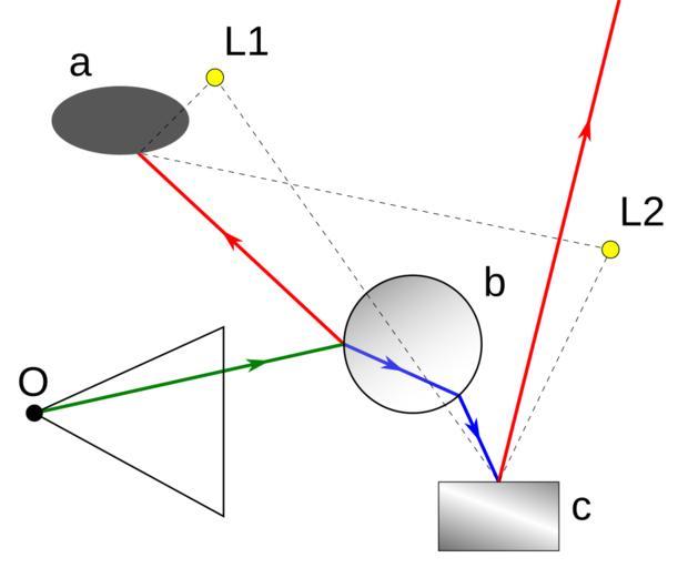 Keywords: Recursive raytracing.svg Idea of recursive raytracing Idea of recursive raytracing The sample 3D scene has two lights and 3 objects a - oval nontransparent nonreflecting b - sphere transparent and reflecting c - cube nontransparent but reflecting Observer camera is placed at point O Primary ray green is emited from O and hits object b Since this object reflects and refracts light two secondary rays are emitted from hit point red for reflected and blue for refracted ray Reflected ray hits object a and none secondary rays are emitted Refracted ray hits object b and is refracted one more time reflected ray hasn't been show however it should be emitted too This ray hit object c and just one reflected ray is emitted It do not hit any object and recursion stops Thin dashed lines are shadow rays - additional rays use to determine visibility of light object b occlude light L1 when point on b is shading when point on a is shading object blocks light L1 Computer graphics Ray tracing Shading