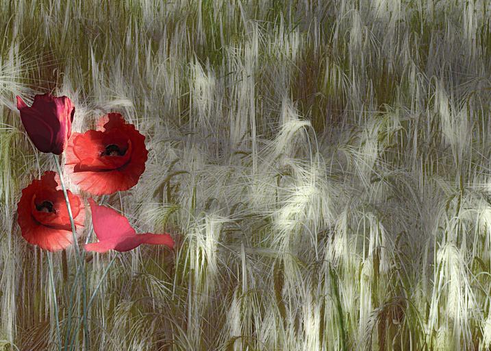 Keywords: red poppy papaver rhoeas corn field nature plants flower wheat cereals agriculture field countryside scenic darkened computer graphic design digital art artwork