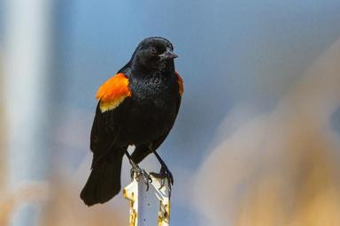 Keywords: red winged blackbird bird blackbird perched post fence black wildlife orange nature outdoors looking