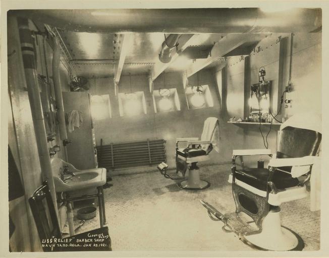| Keywords: history indoor monochrome surreal photo border REEVE 0035196 1. HOSPITALIZATION. 2. NAVY, U.S.S. RELIEF, BARBER SHOP. "U.S.S. RELIEF, BARBER SHOP (LOOKING PORT.) NAVY YARD, PHILA. JAN. 25, 1921." [HOSPITAL SHIP. TRANSPORT OF SICK AND WOUNDED. SANITATION.] Courtesy of the National Museum of Health and Medicine REEVE 0035196 1. HOSPITALIZATION. 2. NAVY, U.S.S. RELIEF, BARBER SHOP. "U.S.S. RELIEF, BARBER SHOP (LOOKING PORT.) NAVY YARD, PHILA. JAN. 25, 1921." [HOSPITAL SHIP. TRANSPORT OF SICK AND WOUNDED. SANITATION.] Courtesy of the National Museum of Health and Medicine |