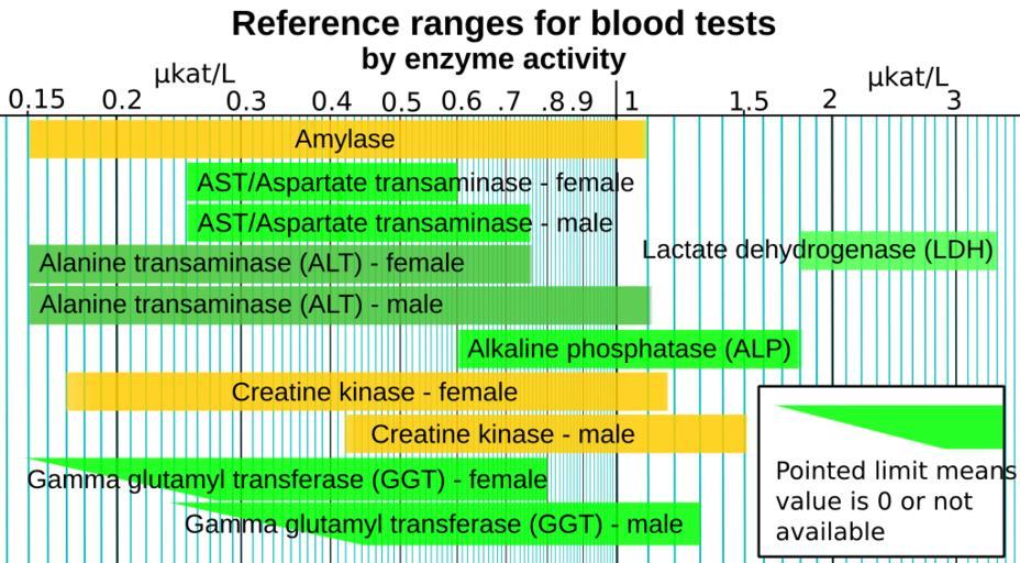 | Keywords: Reference ranges for blood tests - by enzyme activity.svg en Reference ranges for blood tests sorted by enzyme activity Values taken from Wikipedia article see en Reference ranges for blood tests Originally made in Inkscape by Mikael Häggström Please list any needed edits on list on the png version own Mikael Häggström 2010-02-20 thumb left png-format Blood values gallery Blood values | ||||