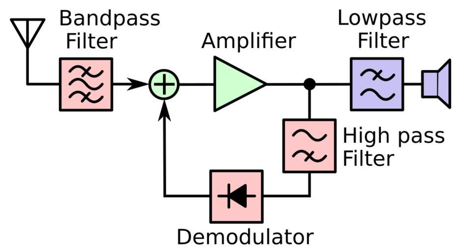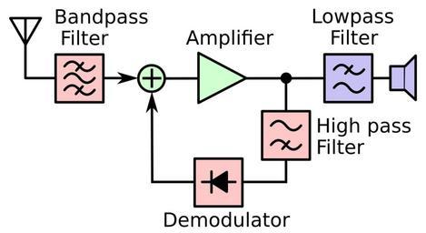 Keywords: Reflex receiver block diagram.svg reflex radio receiver an unusual type of radio receiver invented by Marius Latour and William Preiss in 1917 that was used to a limited extent in the 1920s The distinguishing feature of the reflex circuit is that the amplifier is used to amplify both the radio frequency RF and audio frequency AF signals at the same time It functions as a tuned radio frequency TRF receiver The RF signal from the antenna after passing through the bandpass filter a tuned circuit which selects the frequency of the station desired passes through an amplifier consisting of one or more vacuum tubes or transistors then passes through the high pass filter to the demodulator which extracts the information bearing modulation audio signal from the radio carrier wave This is fed back and passes through the same amplifier again which does the audio amplification passes through the lowpass filter which blocks the RF signal and is applied to the speaker Thus the amplifying devices do double duty reducing the number of active devices needed The economical reflex circuit was used in inexpensive single vacuum tube receivers in the early 1920s but feedback problems limited its usefulness 2016-01-07 own Chetvorno other versions cc-zero Receivers Uploaded with UploadWizard Reflex receiver circuits |