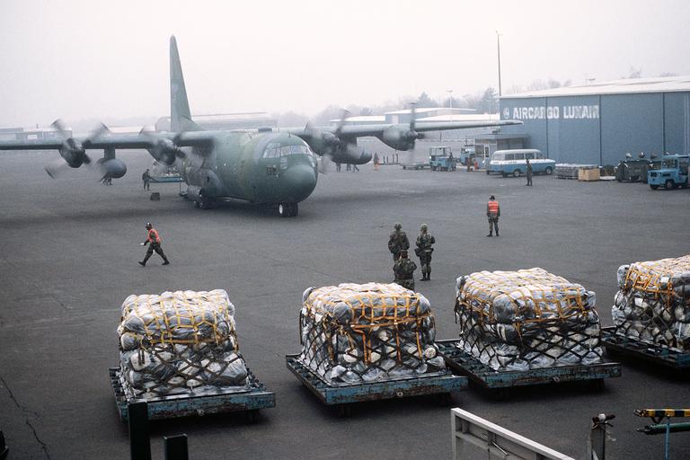| Keywords: Reforger 90 C-130E Hercules Lux Apt DF-ST-91-00047.jpg Pallets of cargo await loading aboard a 435th Tactical Airlift Wing C-130E Hercules aircraft at Luxembourg International Airport in preparation for transportation to West Germany during Exercise Reforger '90 The plane will be loaded while its engines continue to run engine running onload a process which promotes rapid deployment of cargo and personnel 1990-01-07 http //www defenseimagery mil/imagery html;jsessionid 1E8D60B597B0147A7841E405BE5D755C a search s 20DF-ST-91-00047 chk 6cfe0 guid 57a981ba12862010931d06aaf852c83faf28e45b www defenseimagery mil VIRIN DF-ST-91-00047 Master Sergeant Bill Thompson USAF PD-USGov REFORGER 1990 Military aircraft at Luxembourg-Findel International Airport C-130E Hercules United States Air Force Uploaded with VicuñaUploader 435th Air Ground Operations Wing United States Air Force |