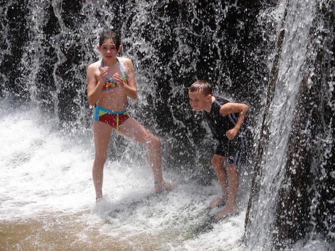Keywords: refreshing water waterfall children play swimsuit cascade wet cool summer refreshment pure clean girl clean water sparkling outdoor vacation boy laugh fun