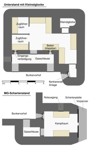 | Keywords: Regelbauten Neckar-Enz-Stellung.svg Beispiele für Regelbauten der Neckar-Enz-Stellung Unterstand mit Kleinstglocke und MG-Schartenstand two examples of norm bunker buildings of the Neckar-Enz-Stellung drawn by myself using drawings of the book Till Kiener Die Neckar-Enz-Stellung Gundelsheimer Bunkerwelten 1 Auflage L Kiener Nürtingen 2002 ISBN 3-00-010420-8 as master 2008-01-24 K Jähne Translation possible kjunix de Neckar-Enz-Stellung | ||||