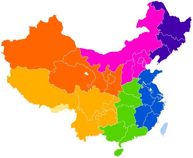 Keywords: Regions of China.svg Číny od horního levého rohu proti směru hodinových ručiček tmavě oranžově severozápadní Čína světle oranžově jihozápadní Čína zeleně středojižní Čína modře východní Čína a světlemodře Čínská republika fialově severovýchodní Čína růžově severní Čína Quintucket 2011-12-25 Maps of regions of China Cc-zero |