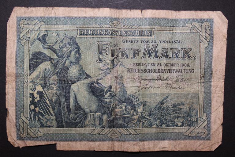 Keywords: reichsmark imperial banknote reich treasury certificate currency inflation money cash and cash equivalents economy economic crisis loss financial crisis financial world finance bank note funds bills paper money pay value mark five mark