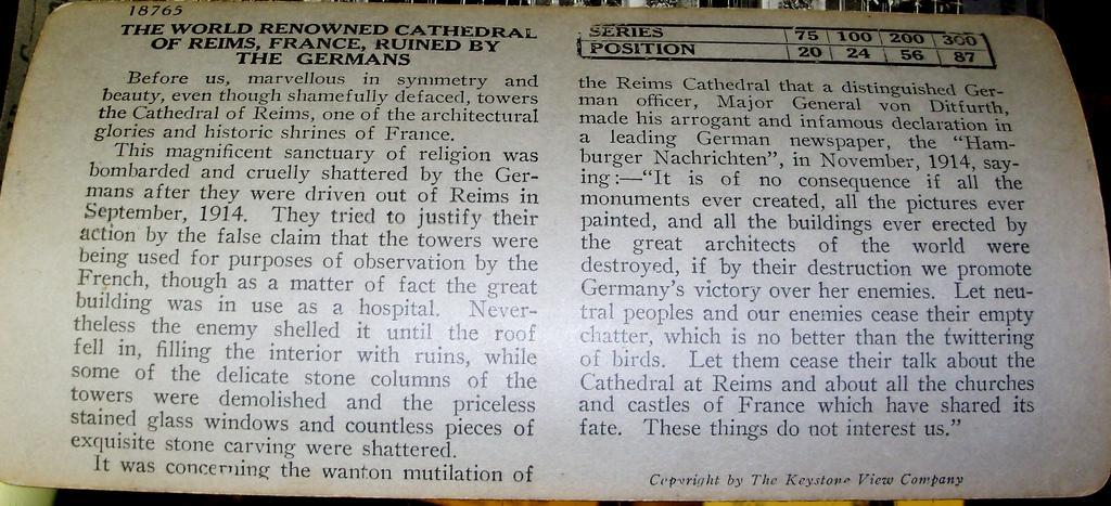 Keywords: Reims Cathedral Ruined by Germans - Stereocard - rear.JPG Reims Cathedral was bombarded by Germans after they were driven from Reims during World War I Quote from German Major General about incident included photo of rear of stereocard by User Roseohioresident at village museum in Auburn Township Tuscarawas County Ohio Ragersville Ohio Keystone View Company copyright ~ 1919 public domain <gallery> file Reims Cathedral Ruined by Germans - Stereocard JPG front of card </gallery> PD-1923 Roseohioresident DEFAULTSORT Reims Cathedral -World War I - rear Reims Cathedral during World War I Stereo cards of World War I |